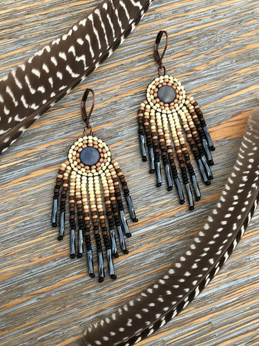 Dark Metallic Matte Silver, Matte Bronze, Iridescent Beaded Shell Strand Earrings